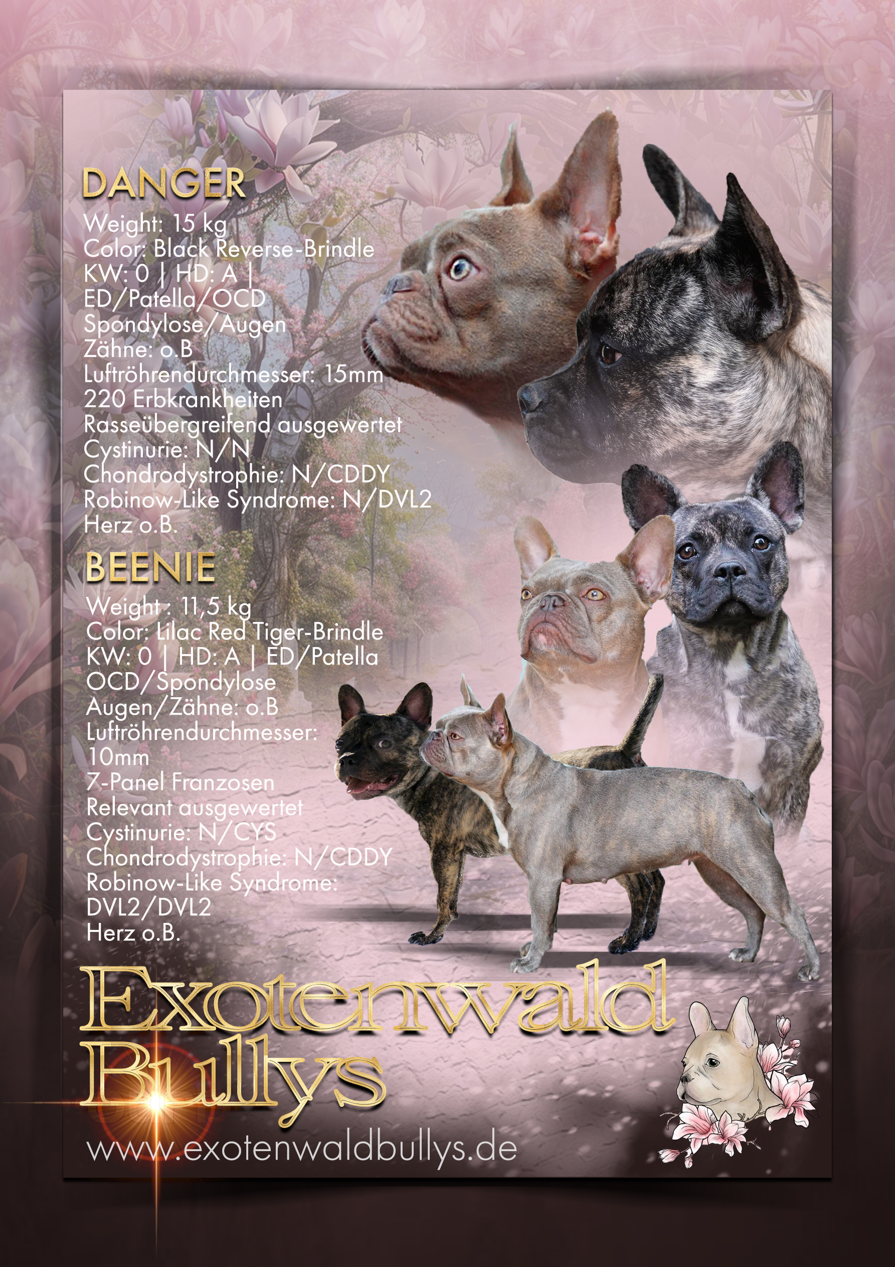 Voller stolz zeigen wir euch die kleinen Schätze aus unserer einzigartigen Verpaarung von Beenie und Danger. Das Augenmerk liegt hier, wie schon bei unseren I-chen speziell auf Chondrodystrophie , eine Erbkrankheit bei der nur wenige Bulldoggen ohne Fremdeinkreuzung  gut aufstellt und die gänzlich freien Vertreter rar sind. Wir sind unsagbar dankbar mit Danger ebenso die Chance bekommen zu haben auch erstmals DVL2 Träger Bullys zu begrüßen. Danger bringt eine vollständige, lange Rute mit und einen sehr langen Fang. Sein Fell trägt er im schönen klassischen Brindle mit Stromung in „Reverse“.